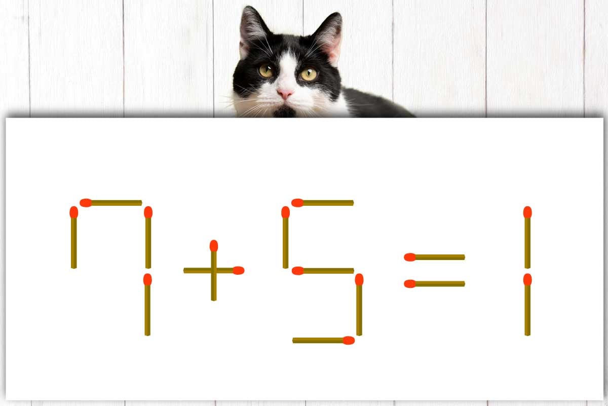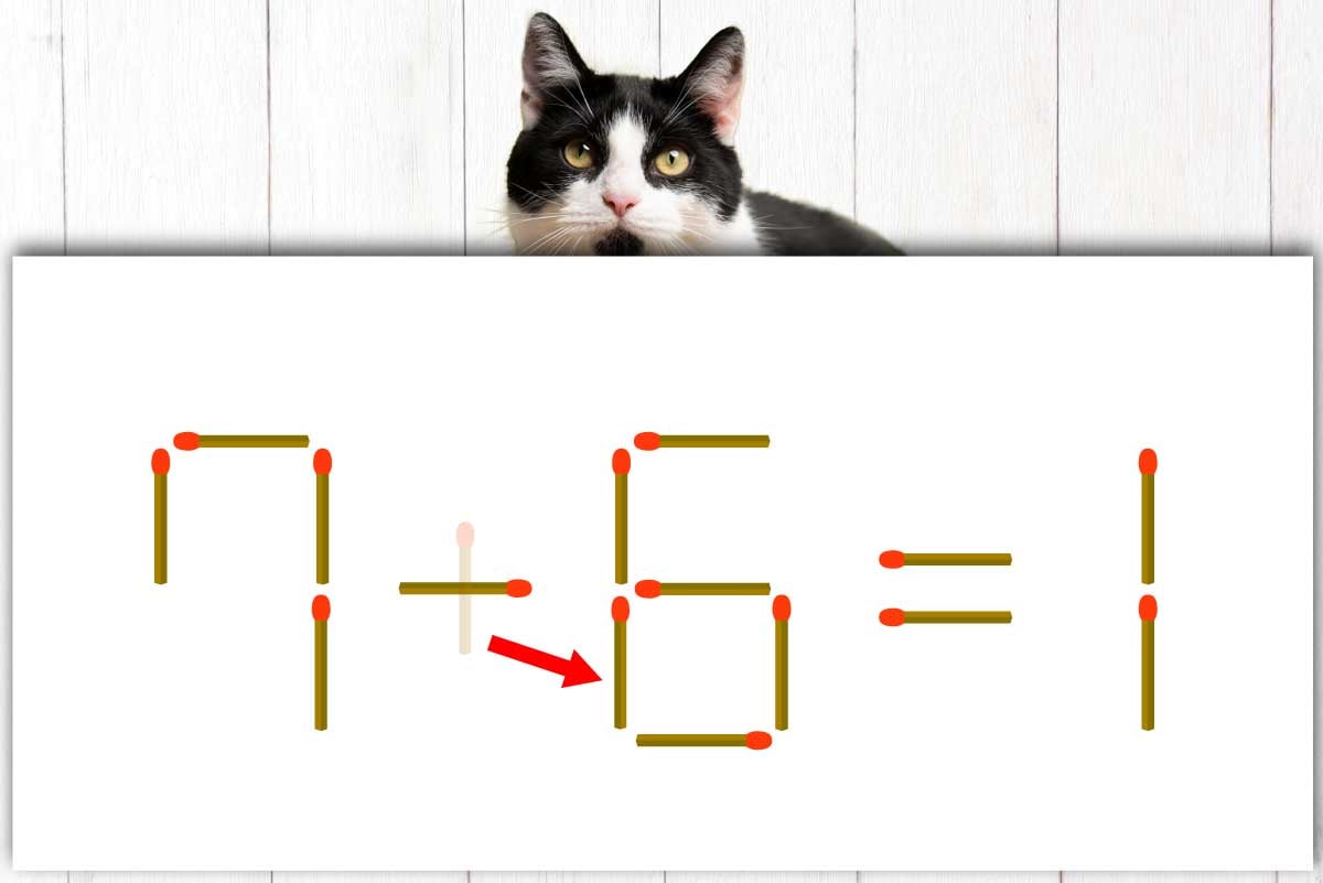 「+」のマッチ棒を1本、「5」に移動させて「6」を作り、「7-6=1」にする。※解答は複数ある場合があります。