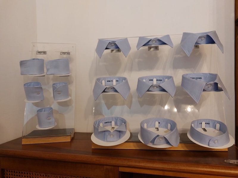 マンション内は弁護士のオフィスばかりという環境で、完全予約制。店員さんがつきっきりで、生地の選択、スーツの形、シャツの襟からカフスのタイプにいたるまで、希望をかなえてくれます。