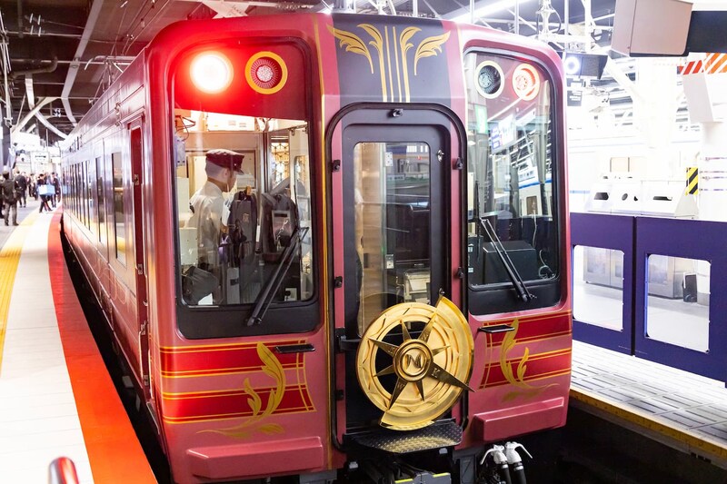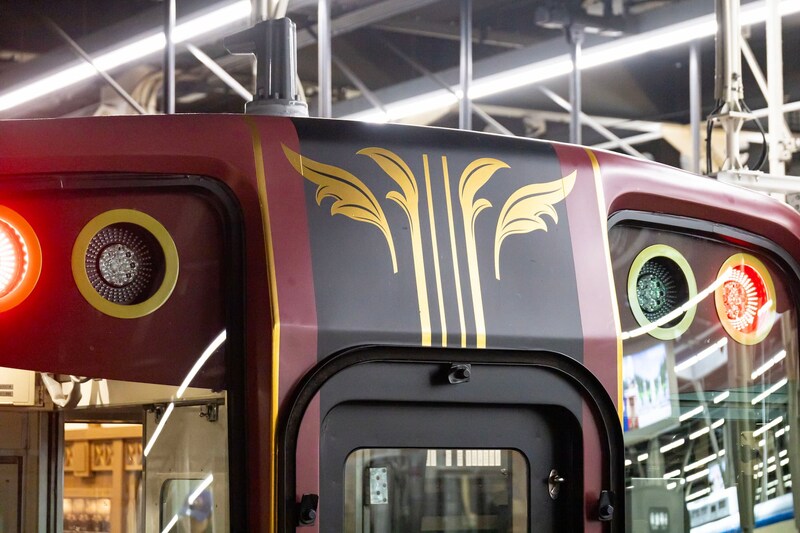 ホームに現れた「GRAN 天空」は、シック&ゴージャスな佇まいが印象的。外観デザインは深紅をベースにゴールドを配し、落ち着きの中にも華やかさを感じられるものです。明治から昭和初期のアーツ&クラフツの精神とアールヌーボーのデザインを再現すべく、線の強弱やカーブの角度など、細部までこだわりが詰められています。