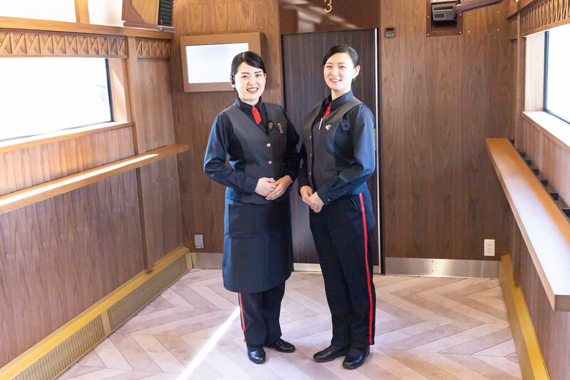 専属アテンダントの制服は、現在の南海電鉄の制服デザインも手掛けるコシノジュンコさんが新たにデザインしたもの。黒をベースにしたシックな装いが新鮮です。