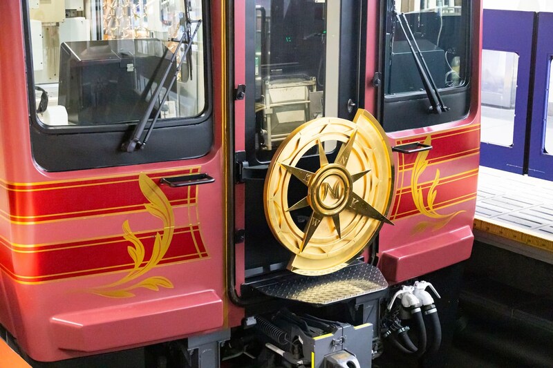 ゴールドに輝くエンブレムのモチーフには羅針盤が使われています。羅針盤は通常の方位(NESW)ではなく、南海沿線各地の盛り上がりを波及させたいという思いから、難波、高野山、和歌山、関西国際空港、それぞれの頭文字から「NKWK」になっているのにも注目です。このデザインは3号車のフロアでも見ることができるので、ぜひ探してみてくださいね。