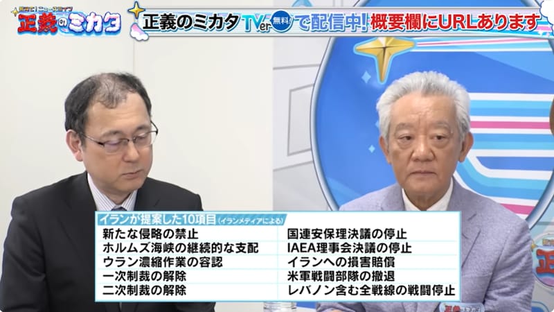 最強専門家がニュースの正しいミカタを徹底解説する情報バラエティ番組「教えて!ニュースライブ 正義のミカタ」(ABCテレビ)。久保光代アナがMCを務める番組公式YouTube「正義のミカタチャンネル」で4月21日に公開されたのは、4月18日土曜日の生放送後に収録されたトーク解説だ。中東研究の第一人者・高橋和夫氏と、中国に精通する近藤大介氏が、イラン情勢をテーマに“OA延長戦”を繰り広げた!