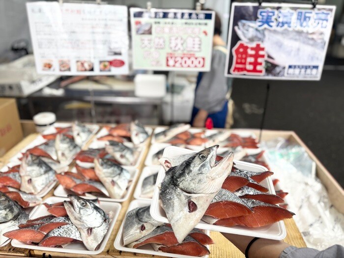 実演販売、北海道広尾産、「天然 秋鮭」丸一匹、分厚くカットかれた鮭の切り身は一盛り¥2000!!家計に優しいお祭り価格