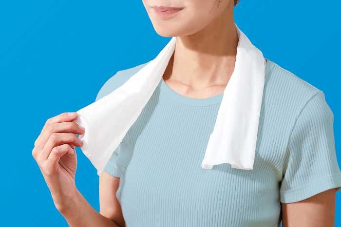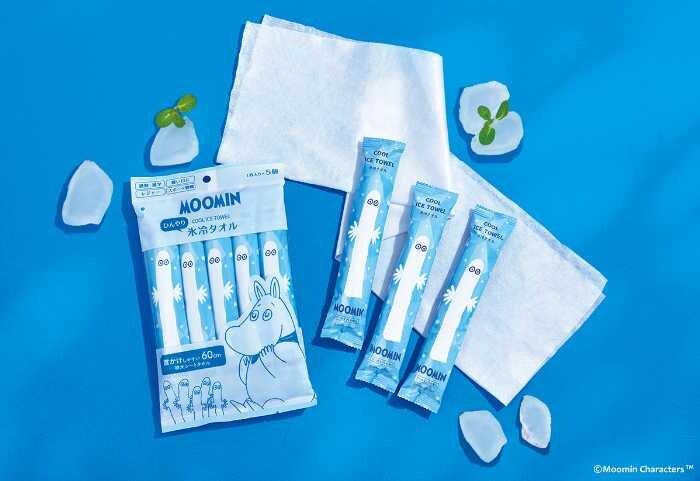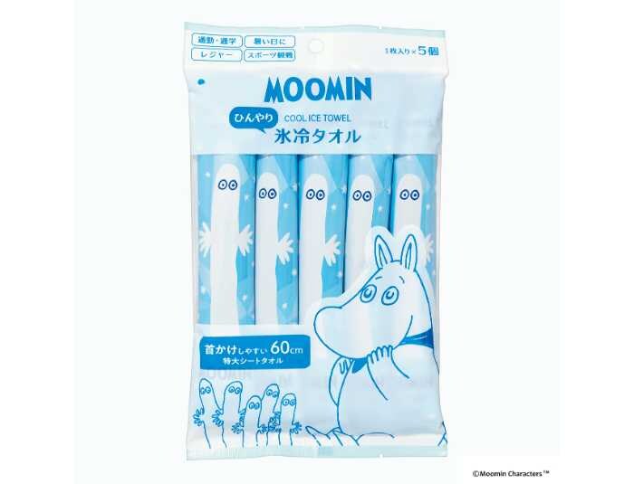 「MOOMIN氷冷タオル」は、30×60cmの大判サイズで首にかけて使える実用性の高さが魅力。価格は726円(税込)、セット内容は約W300×600mmの氷冷シートタオル5個入りです。