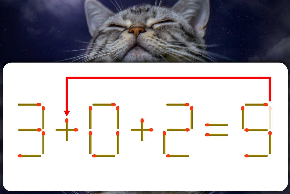「9」のマッチ棒を1本、「-」に移動させて「+」を作り、「3+0+2=5」にする。※解答は複数ある場合があります。