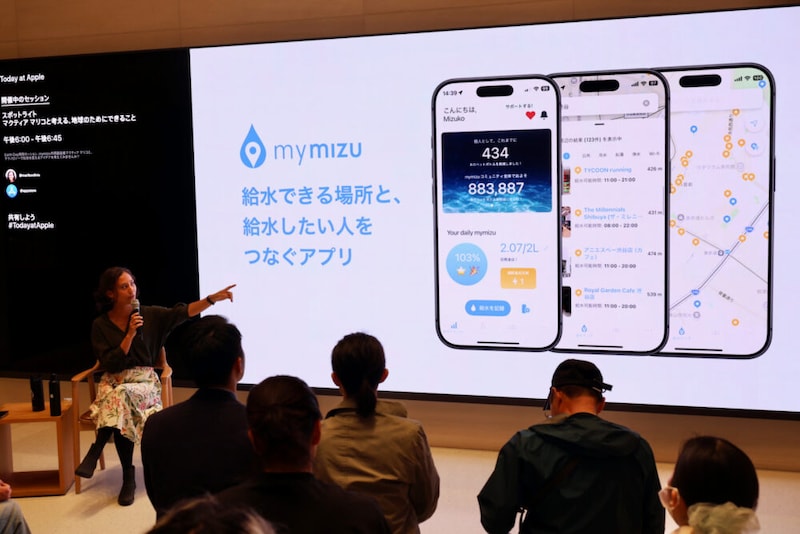 4月23日木曜日、アースデイに合わせてアップル丸の内で、mymizu共同創設者のマクティア・マリコさんがToday at Appleのセッションに登壇した。mymizuはペットボトルゴミを出さない世界を作るためのアプリ。マリコさんがmymizuについて、どのように着想し、開発し、どのように広がっていったか語った。