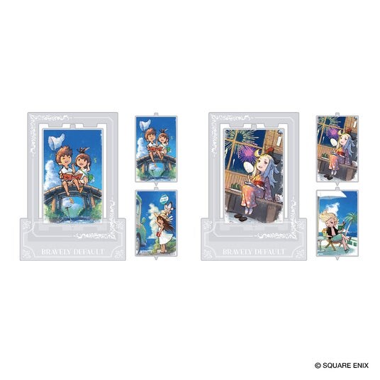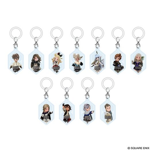 立体感のある2層構造を採用し、フィギュアパッケージのように見える新感覚のキーホルダー。透明感のあるアクリル越しに覗くキャラクターが、存在感のある佇まいを演出します。『ブレイブリーデフォルト』の主人公たち4人に加え、『ブレイブリーセカンド エンドレイヤー』からユウとマグノリア、『ブレイブリーデフォルトII』からセスたち4人の主人公をラインナップしました。