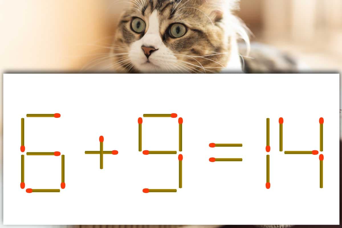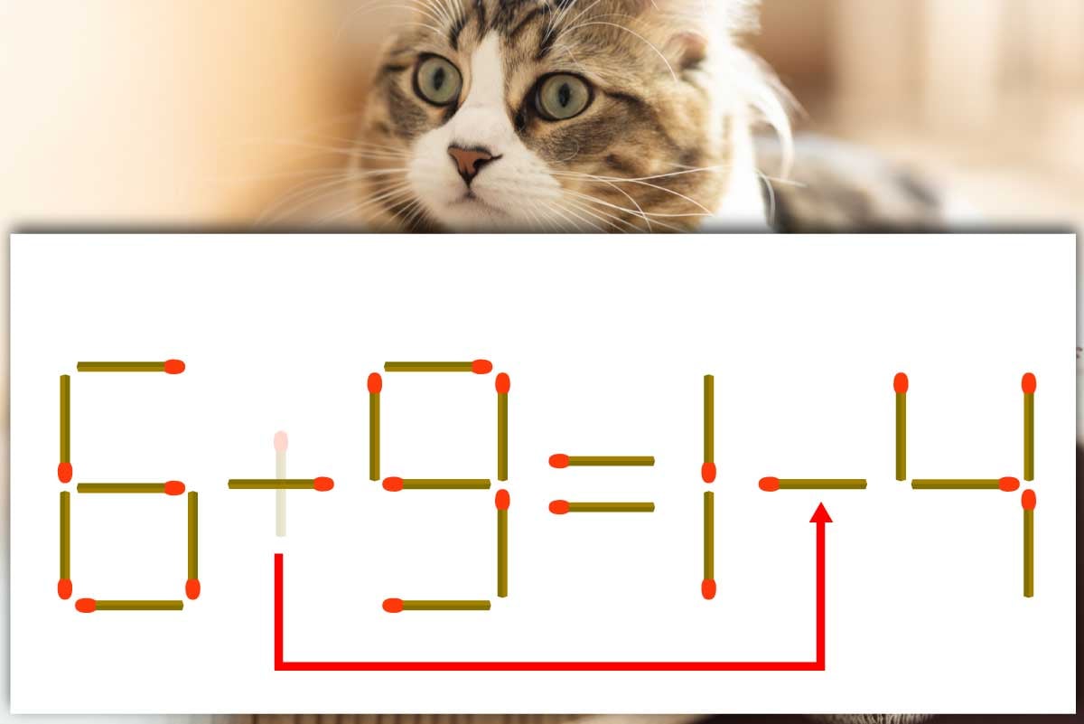 「+」の縦向きのマッチ棒を取り、横向きに回転させ「1」と「4」の間に入れ、「6-9=1-4」にする。※解答は複数ある場合があります。