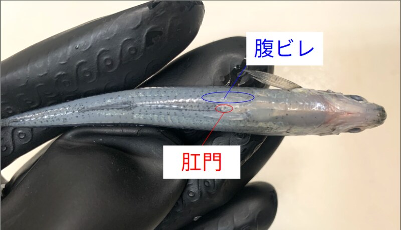 ギンイソイワシの肛門は腹ビレの後方にありますが、トウゴロウイワシの肛門は腹ビレの直径の真ん中あたりにあります。