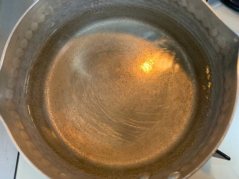 ②濃度4%ぐらいの塩水を鍋に張り、80℃ぐらいまで温めます。