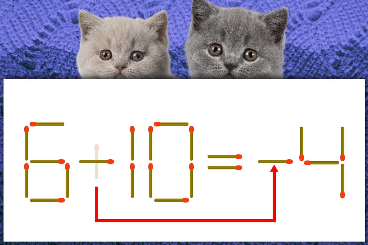 「+」のマッチ棒を1本、「=」の後ろに移動させて「-」を作り、「6-10=-4」にする。※解答は複数ある場合があります。