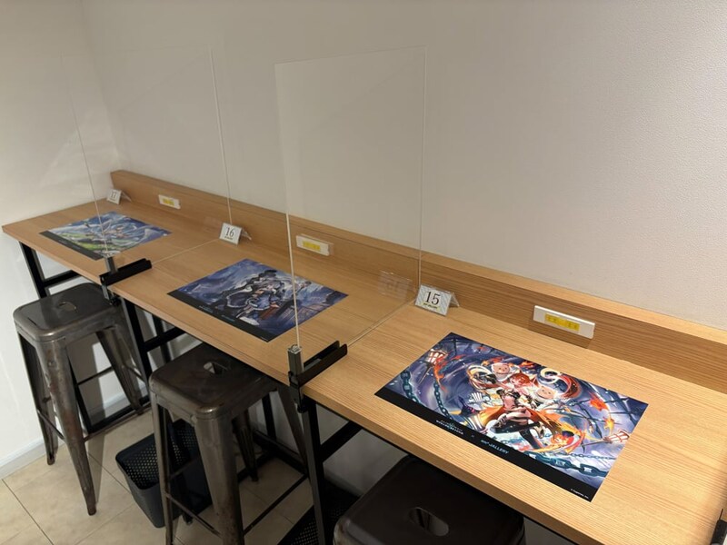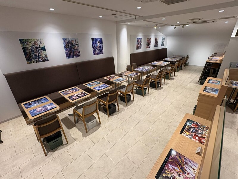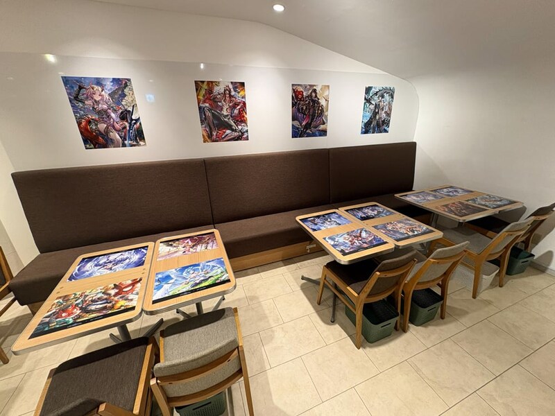店内に一歩足を踏み入れると、テーブルに貼られたレジェンドカードのイラストが目に飛び込んでくる。どのテーブルに案内されるかはランダムなので、自分の推しキャラに出会えるかどうかは完全に運任せ。ここは“運が試される”コラボカフェと言っていいだろう。「これも運……」。
