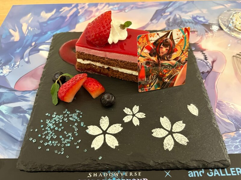 八界花を彷彿とさせる装飾はゲテンオウのイメージそのままで、ケーキのまわりには苺などの果実も彩りよく配されている。そして、黒皿とのコントラストが素晴らしい。