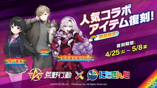 さらに、月ノ美兎、叶、壱百満天原サロメのコラボアイテムも復刻登場。以前入手できなかったプレイヤーにとっては、再び入手できる貴重なチャンスとなります。