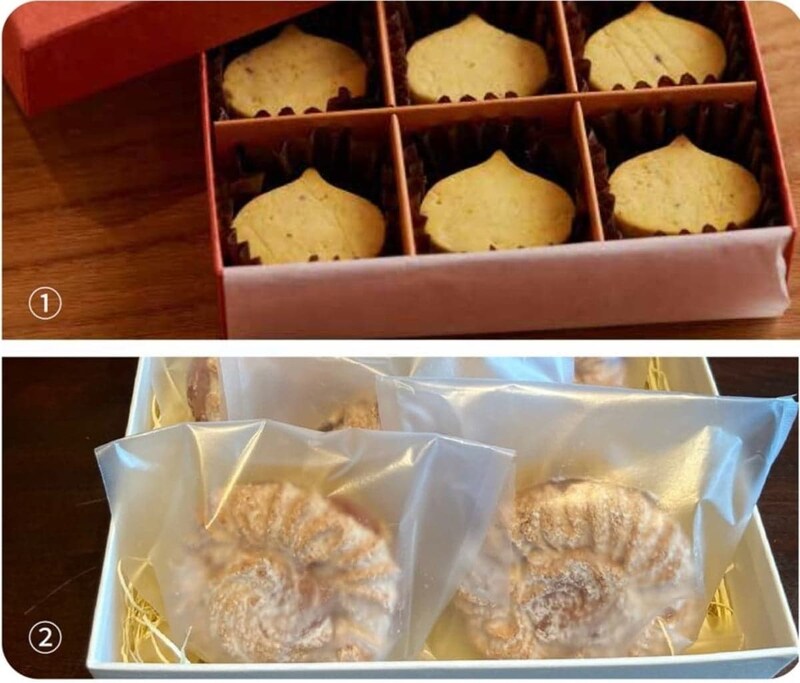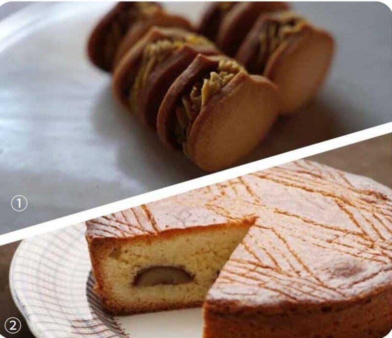 上から、<ka ha na ‒菓葉絆->「マロンバターサンド」(1,301円/2個入り)※阪神梅田本店限定、<ラトリエ ドゥ マッサ>「ガトーバスク・マロン」(2,592円/1個)