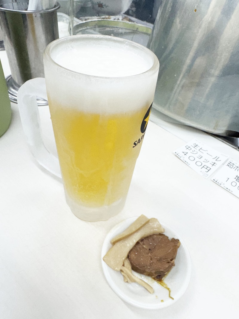 ビールを注文しただけで、無料のチャーシューとメンマが食べられる幸せ。
