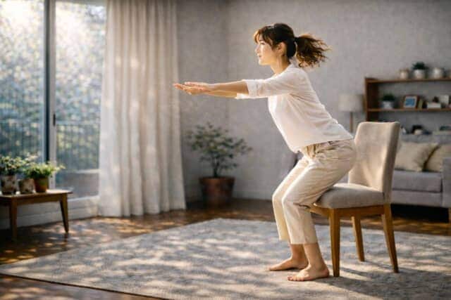 下半身・体幹・上半身を同時に使うエクササイズです。椅子の前に立ち、腰を後ろに引くように軽くしゃがみ、お尻が座面に触れる直前でストップ。しゃがむと同時に腕を肩の高さまで前に伸ばして、かかとで床を押すように立ち上がります。