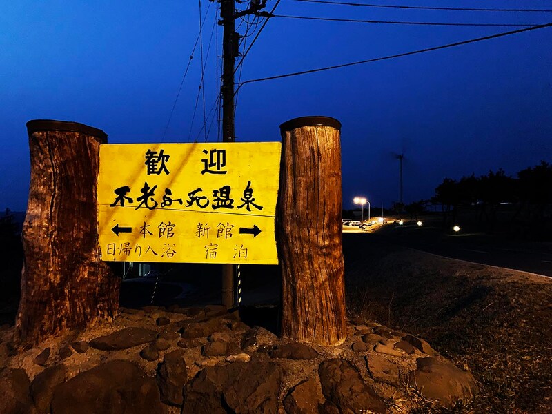不老ふ死温泉は艫作駅から徒歩10~15分ほどの場所に位置する(ウェスパ椿山駅からは列車の発着時刻に合わせて送迎バスを運行している)。名所である十二湖や日本キャニオンにも立ち寄ったため夜暗くなってから到着したが、ありがたいことにスタッフは温かく迎えてくれた。