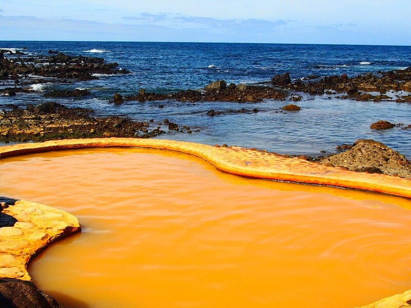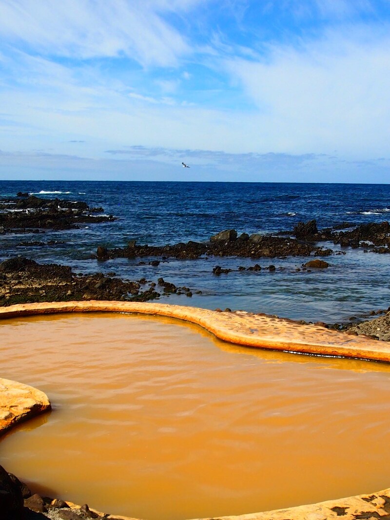 不老ふ死温泉は、施設内に源泉かけ流しの「不老ふ死の湯」と「黄金の湯」「日本海パノラマ展望風呂」など複数の湯があるが、名所ともいえる「海辺の露天風呂」に入らずして帰るわけにはいかない。海岸線に沿って露天風呂があるため、その風景はまさに絶景。時間帯や天候によっては波が露天風呂に入ってくることもある。まさに大自然と一体化した露天風呂だ。この温泉のためだけに行く価値があるといえよう。