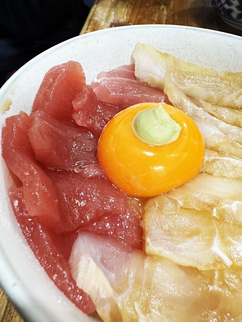 目の前にやってきた平目とマグロ漬丼は、あまりにも魅力的なビジュ良いやつだった。ご飯が見えないくらいたっぷりと大量に敷かれた平目とマグロの漬け。そこに美しい卵黄が盛られており、その上にワサビがのっている。漬けはどれも柔らかそうな流線型を描いていて、食べる前から「これ絶対ウマイやつ!」と思わせる魅力を放つ。ご飯は少なめな印象だが、食べ終えたあと、ご飯少なめだからこそベストだと気がつく。旨味が濃い魚介が強調されて楽しめるからだ。