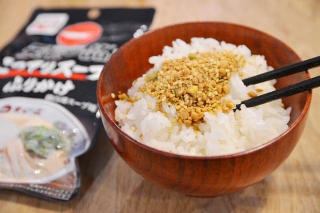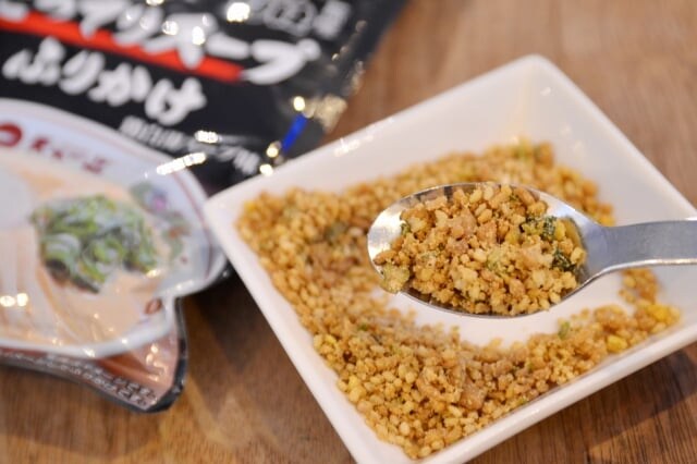 ちなみに、よくも悪くも目立っているのはゴマですね。これによって香ばしさがアップして、ふりかけとしてのおいしさは増していると思います。ただ、『天下一品』のスープにゴマの風味はないので、再現という観点では邪魔している気も。