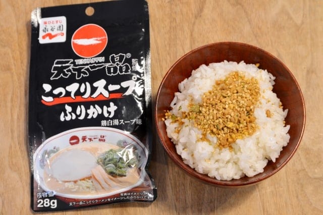 そしてやっぱり、味の方向性は確かに『天下一品』的ですね。ご飯とふりかけとが、口で咀嚼(そしゃく)するうちにひとつになり、味がジュワッと広がる感じはあるのですが、ふりかけがドライではなくウェットタイプだと、もっと近くなる気もします。