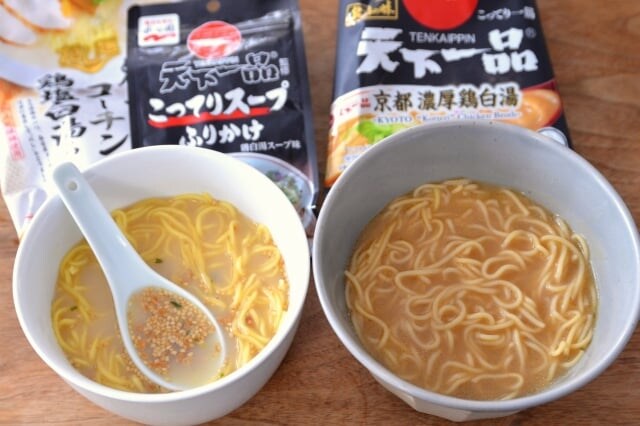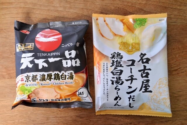 次はちょっとトリッキーに、インスタントラーメンに合わせてみます。用意したのは、サッポロ一番(サンヨー食品)が販売している『天下一品』味の袋麺と、『名古屋コーチン鶏塩白湯らーめん』という名の袋麺。食べ比べやクロスレビューをしてみます。