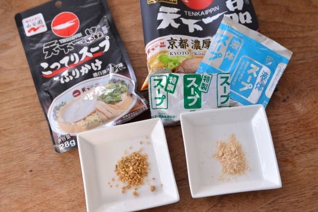 ちなみに『天下一品』商品にはカップ麺もあるのですが、今回フォーカスしたいのはスープの味なので、具は余計。ということで袋麺なのです。まずは『天下一品こってりスープふりかけ』と、袋麺の粉末スープとを比較。