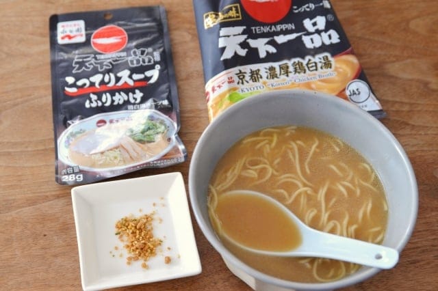 で、『天下一品こってりスープふりかけ』を加えて食べてみると、なるほど確かにコクやパンチがアップ。ただし、ガチな『天下一品』の味に近づけるという意味では、やはりゴマが邪魔になりますね。結論、想像したようなこってり味にはなりません。