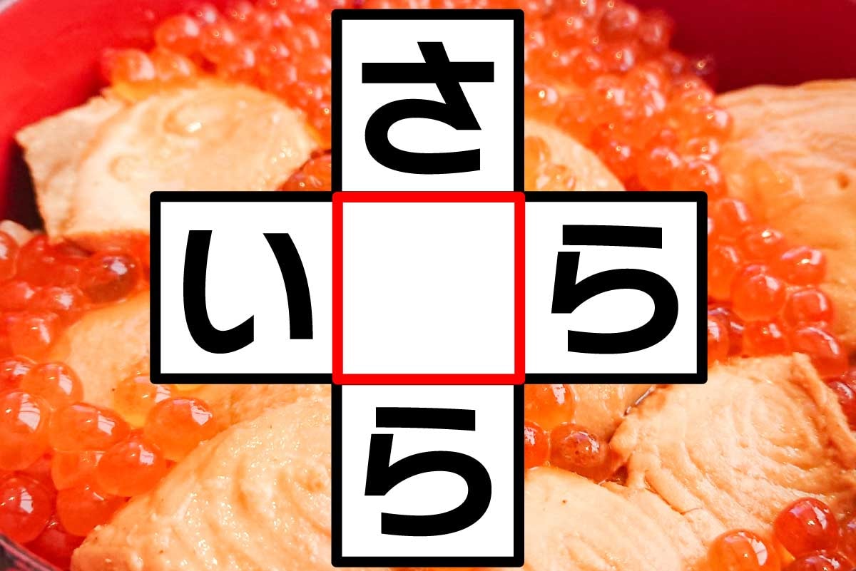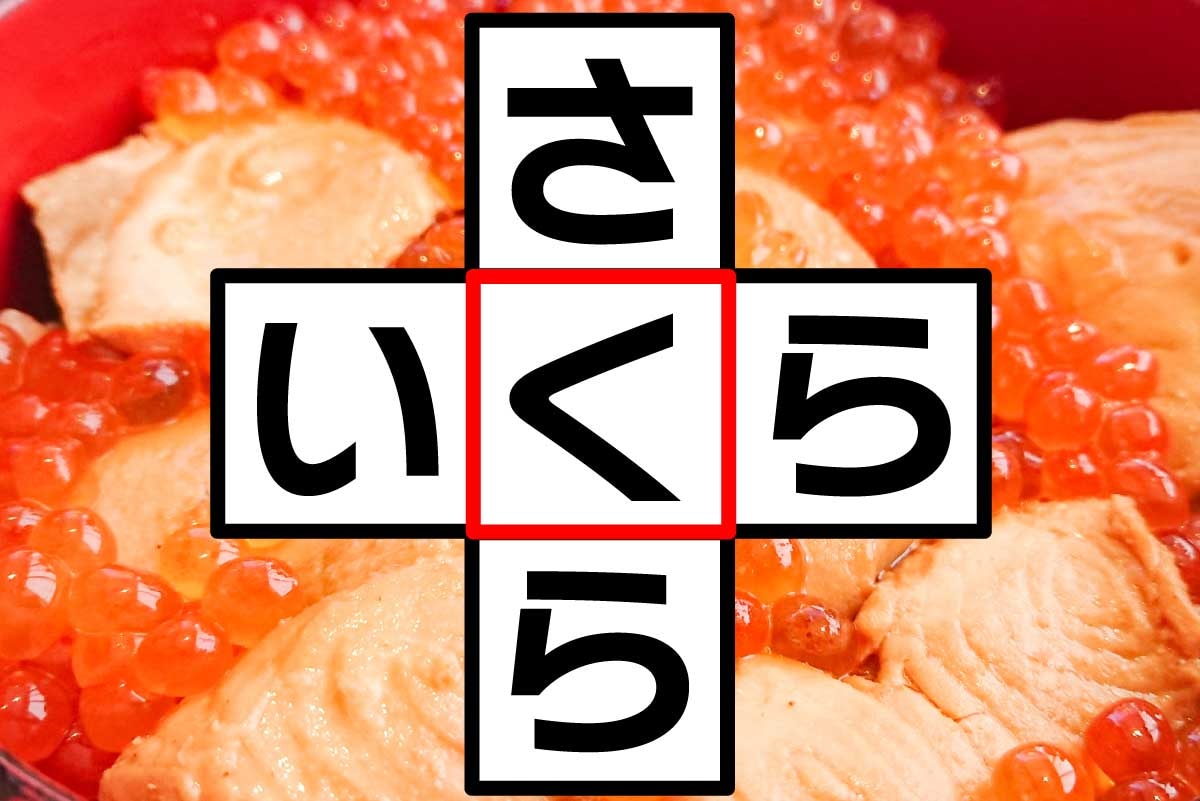【問題】空欄に入るひらがなは? 【ヒント】タテ:一般的に春に咲きます。花は塩漬けにして食すこともある植物はなんでしょう?ヨコ:鮭の卵で、9月~11月頃が旬です。