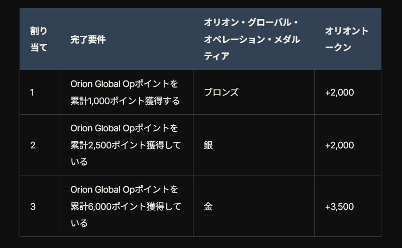 ステージ1では3つの課題に挑み、完了することでオリオングローバルオペレーションメダル。オリオンシーズンメダル獲得に必要なトークンを合計7,500個も獲得できる。
