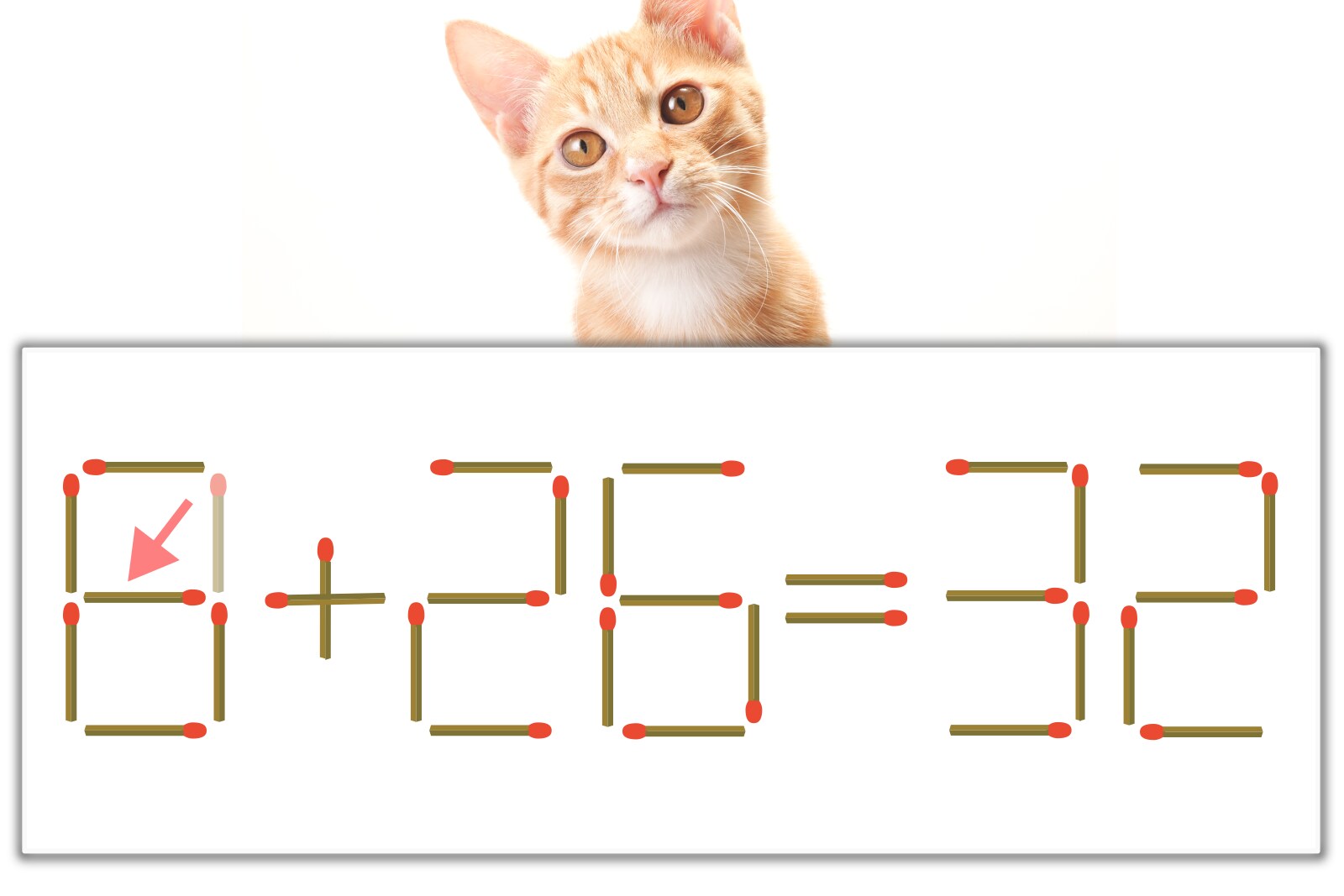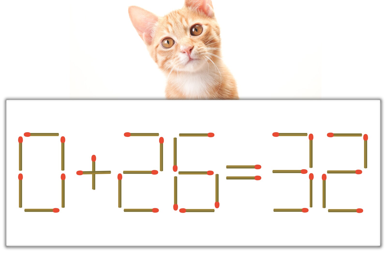 「0」のマッチ棒を1本、左下にスライドさせて「6」を作り、「6+26=32」にする。※解答は複数ある場合があります。