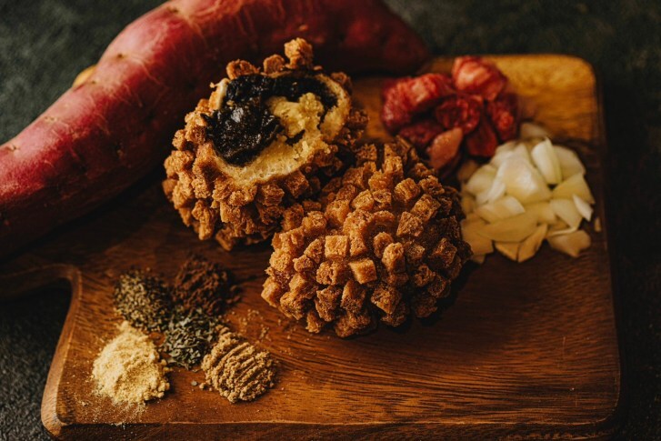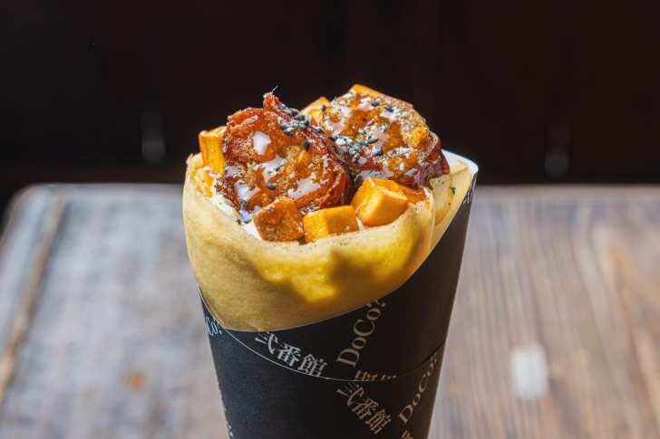 カリカリに素揚げした紅あずまに、燻製醤油を使った大学芋のタレとのり塩フレーバーで仕上げた贅沢なクレープ!