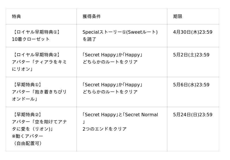 本編ストーリーの配信開始を記念して、アプリ内では早期クリアキャンペーンも開催中です。この機会にぜひ「王子様のプロポーズ Eternal Kiss」をお楽しみください。
