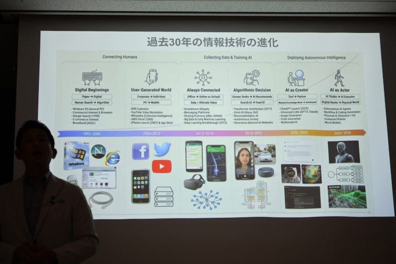 30年前にデジタル化が始まり、スマホ、アプリなどによるそのパーソナル化、モバイル化。それから、VR、位置情報、そして、コンピューターの中でのAIから、リアル社会に影響を与え出すAIと、驚くべき速度でトレンドが変化していっている。