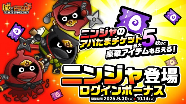 9月30日(金)19:00より、ゲームにログインすると、「ニンジャのアバたまチケット」最大5枚やゲーム内アイテムなどがもらえる「ニンジャ登場ログインボーナス」を開催いたします。報酬は期間中1日1回、最大15日間プレゼントされます。