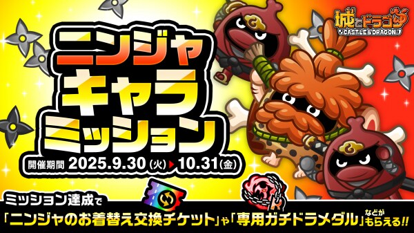 “ニンジャのタマゴを入手”など、用意されたさまざまなミッションを達成すると「ニンジャのお着替え交換チケット」のほか、“ドラゴンメダル”最大100枚や“きびだんご”最大400個、“専用ガチドラメダル”最大7枚を獲得することができます。また、ミッションを規定数クリアすると、ニンジャの限定お着替え「原始セット」やエクストラボイスがもらえます。