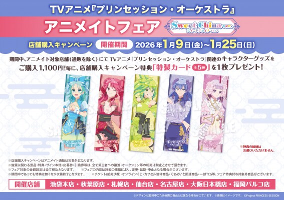 期間中、アニメイト対象店舗(アニメイト通販除く)にて、TVアニメ『プリンセッション・オーケストラ』関連のキャラクターグッズをご購入1,100円(税込)毎に、フェア特典「特製カード(全5種)」を1枚プレゼント!