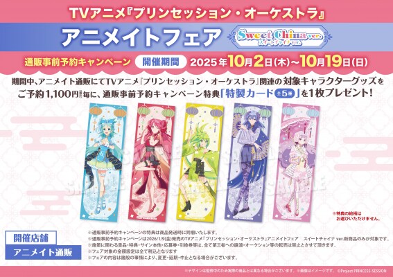 期間中、アニメイト通販にて、対象のTVアニメ『プリンセッション・オーケストラ』関連のキャラクターグッズをご予約1,100円(税込)毎に、フェア特典「特製カード(全5種)」を1枚プレゼント!