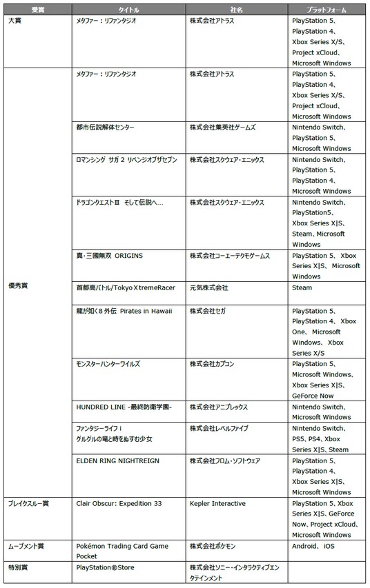 今回で開催29回目を迎える「日本ゲーム大賞 2025」の年間作品部門の大賞を「メタファー:リファンタジオ」(株式会社アトラス)が受賞しましたので、お知らせいたします。また、ブレイクスルー賞は、「ClairObscur: Expedition 33」(Kepler Interactive)、ムーブメント賞は、「Pokemon Trading Card Game Pocket」(株式会社ポケモン)がそれぞれ受賞しました。このほか、対象期間中に話題になった作品、計11作品※が優秀賞を受賞しました。