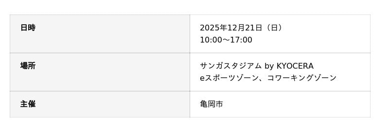 京都府亀岡市(市長:桂川孝裕)は、市制70周年を記念し、2025年12月21日(日)に「eスポーツ大会 KAMEOKA CUP(以下、本大会)」をサンガスタジアム by KYOCERA内のeスポーツゾーンにて開催します。本大会は、eスポーツを「年齢や経験を超えて誰もが競い合えるスポーツ文化」と位置づけ、スタジアムを核とした賑わいの創出を目指す取り組みです。世界的人気格闘ゲーム「ストリートファイター6」の公認大会として実施します。同時に、初心者でも参加できる体験会等も開催し、健康の増進や世代を越えた交流の増加を目指します。