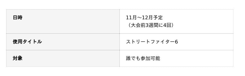 CAPCOM(株式会社カプコン)より公認を受け、競技タイトルには人気格闘ゲーム「ストリートファイター6」を採用しています。最大32チームが参加し、熱いチーム戦を繰り広げます。