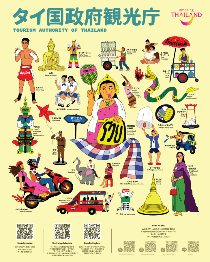 タイ国政府観光庁(TAT)のAmazing Thailandブースでは、タイを「グローバルなポップカルチャーの目的地」として位置づけ、多様な角度からタイカルチャーを紹介。5ブースの体験型コンテンツをご用意し、実際に「遊び、感じ、体験する」ダイナミックなプレイグラウンドとして、タイの新しい魅力を届ける。