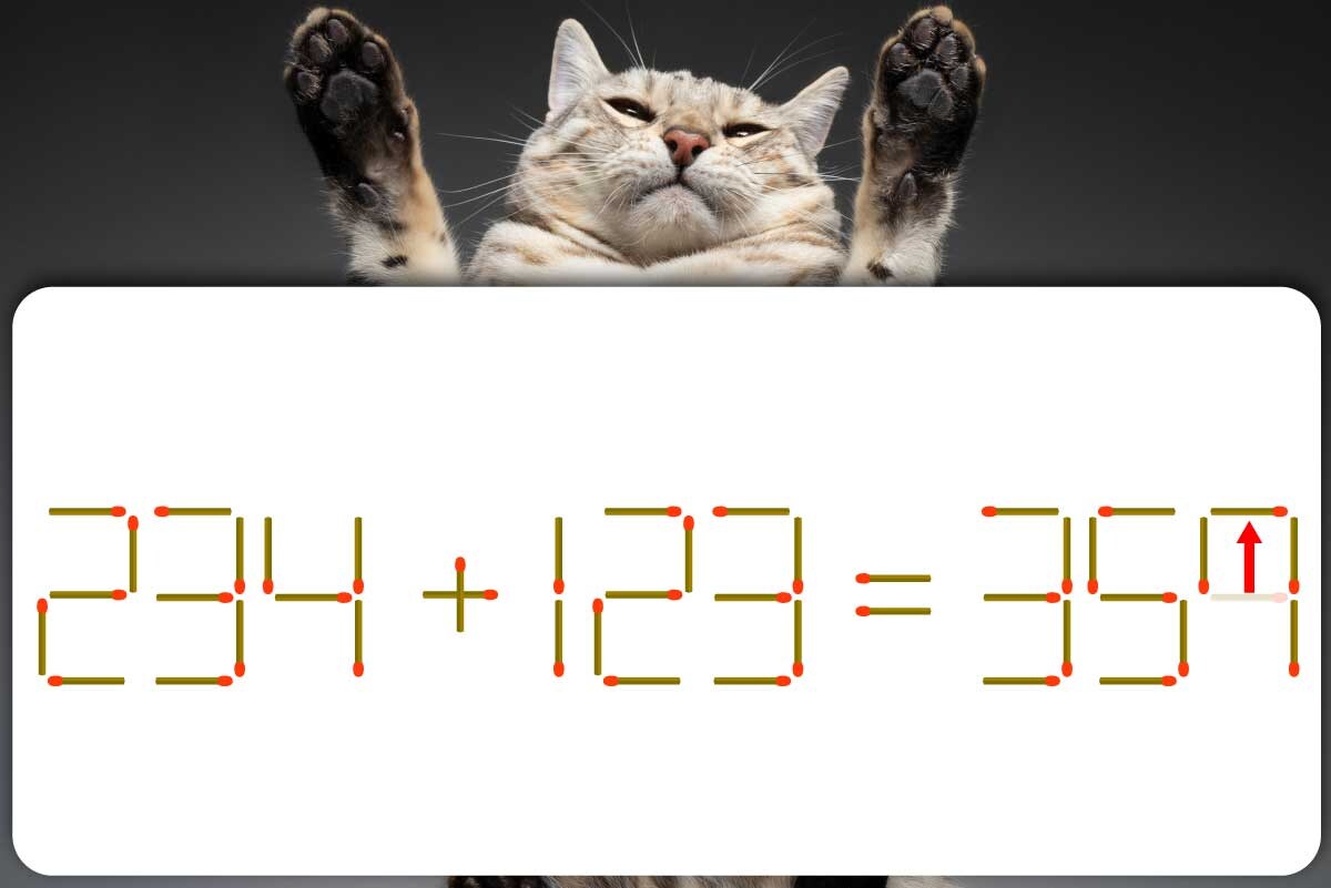 右の答えの「4」の、真ん中の横向きのマッチ棒をそのままスライドしましょう。すると、「234+123=357」と正しい式に変わりました!