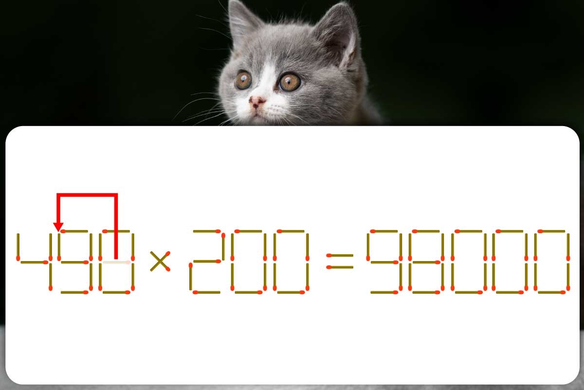 左の式の「8」にある横向きのマッチ棒を取りましょう。縦向きに回転させ、左隣の「3」の左上に入れます。式が「490×200=98000」になり、両辺の数が一致しました!
