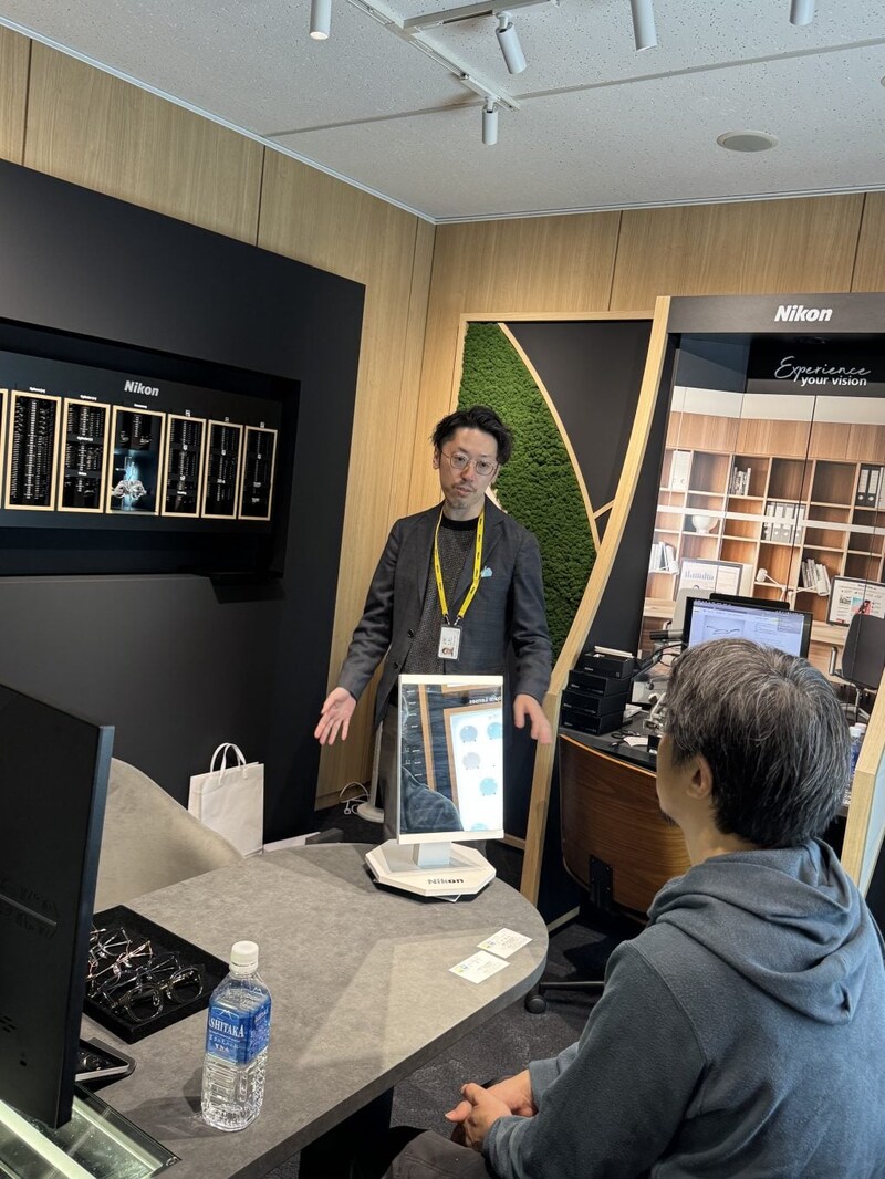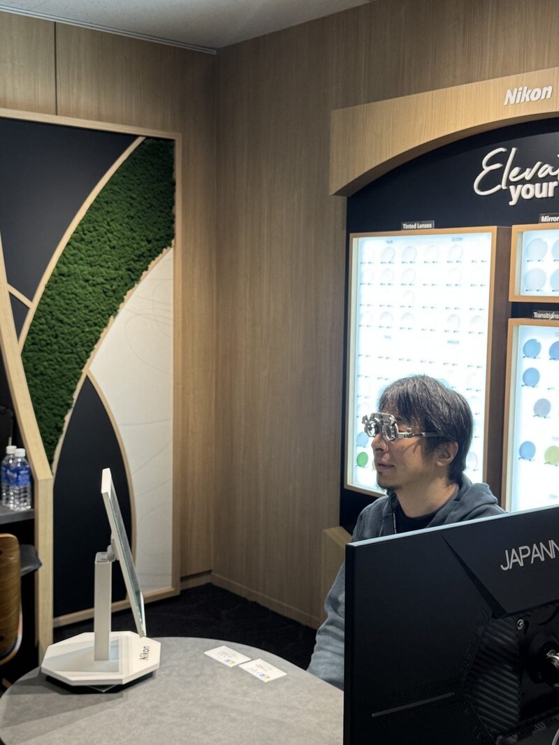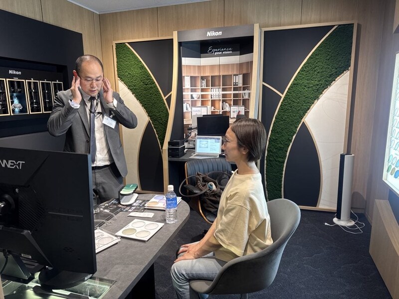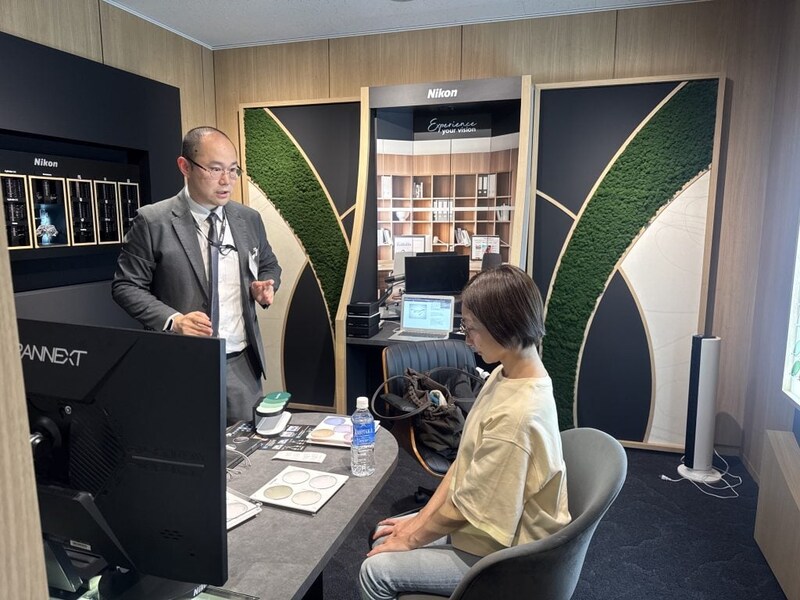 ニコン・エシロールが大切にしているのは、視力測定や生活の使用場面を想定した見え方の確認を通して店頭で「見え心地」を体験するメガネ作り。従来の25倍の精度で度数を設定できる視力測定機器「Vision R800」を使ったり、スタッフさんが丁寧に見え方を確認しながら測定してくれます。