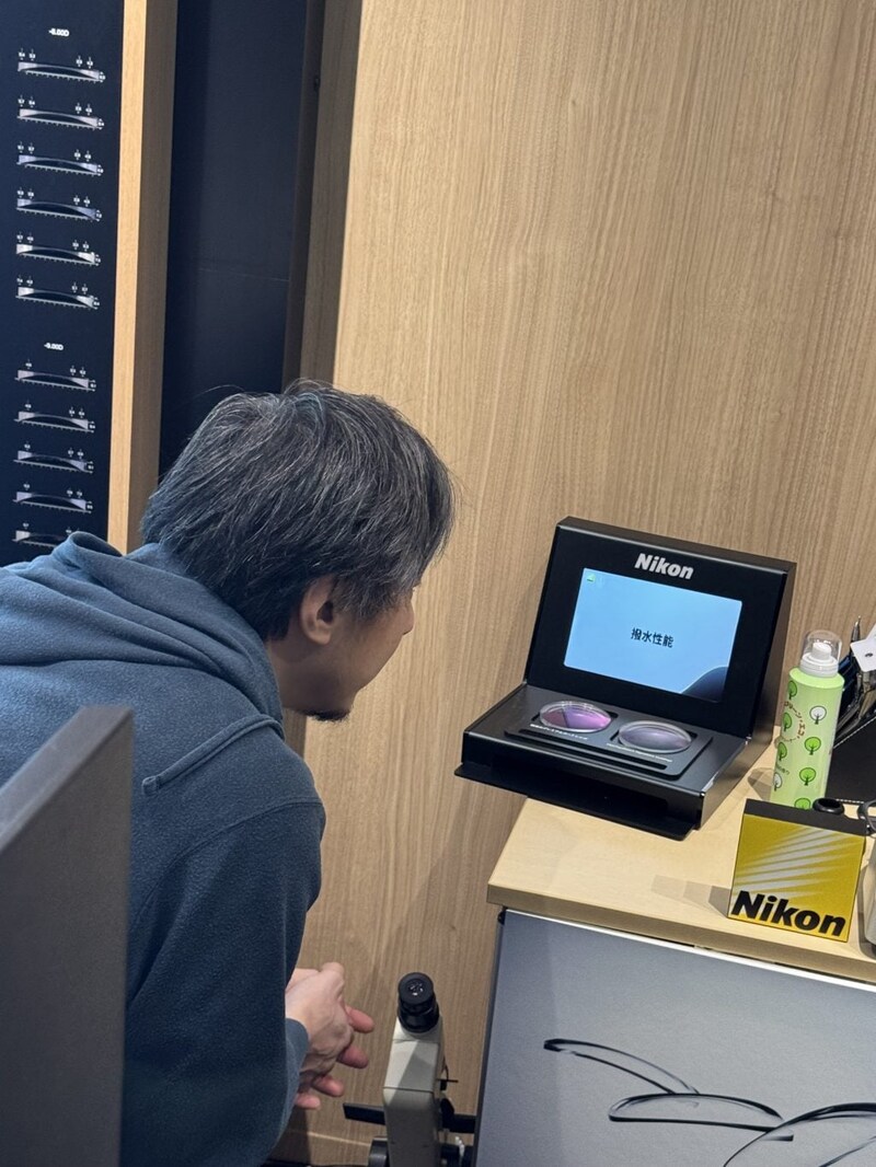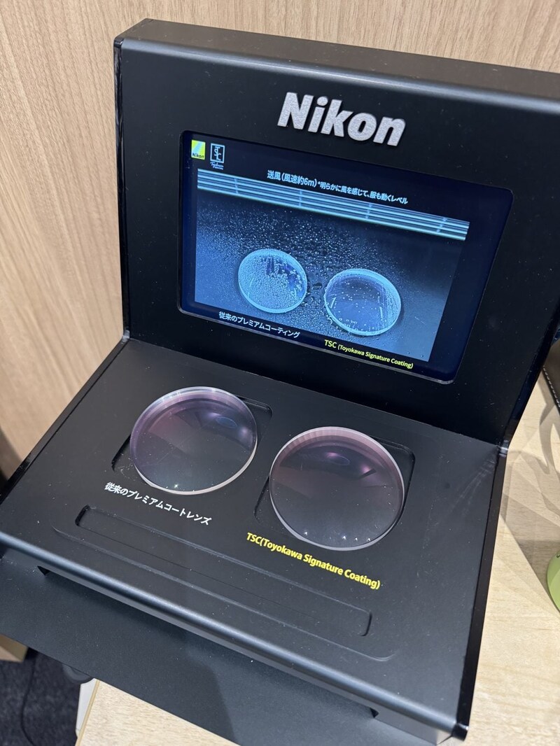 2月に発売したばかりのニコン最高峰のコーティング「Toyokawa Signature Coating」に興味津々なひろゆきさん。愛知県豊川市にあるニコン・エシロールのフラッグシップ工場「愛知ラボラトリーオブエクセレンス(ALEX)」でしか製造できないという新開発のコーティングで、従来とくらべて耐キズ性、撥水性、耐久性が格段にアップ。実際に触れてみるとその滑らかさに驚きますので、ぜひ店舗で試してみて。