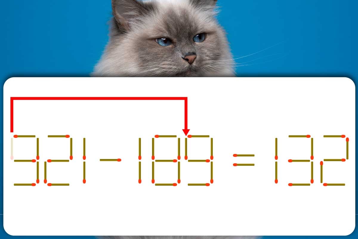 「9」の左上にある縦向きのマッチ棒を取り、「3」にしましょう。取ったマッチ棒を、左の式の「3」の左上に入れ「9」にします。これにより、「321-189=132」と正しい式になりました。