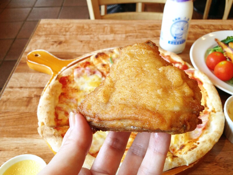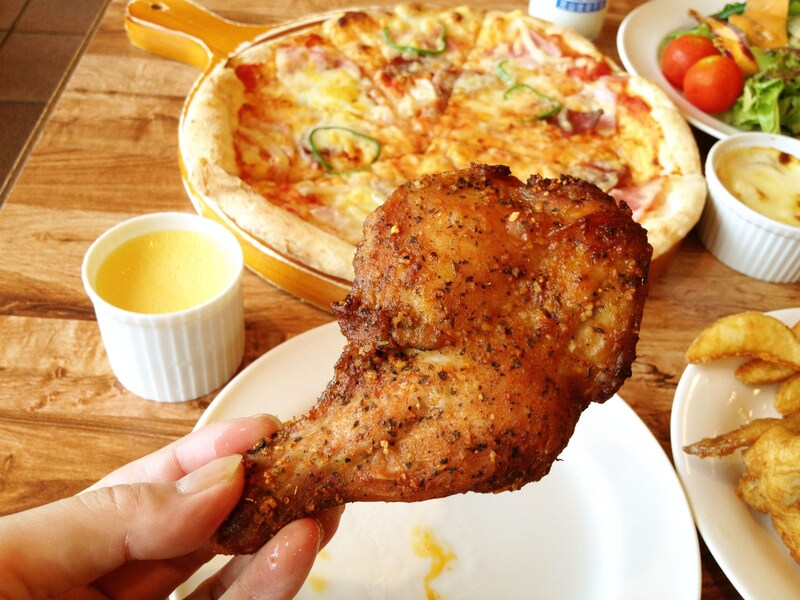 ハーベスター八雲は広大な緑の大地に囲まれた場所にあり、テラス席からは大地と海を眺めることができる絶景レストラン。店内は温暖色でぬくもりを感じる居心地の良さで、そんな環境のなか、本格的な唯一無二のフライドチキンやピザなどのグルメを堪能できる。