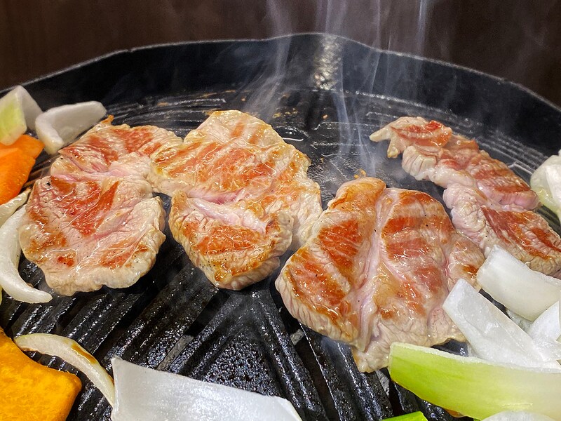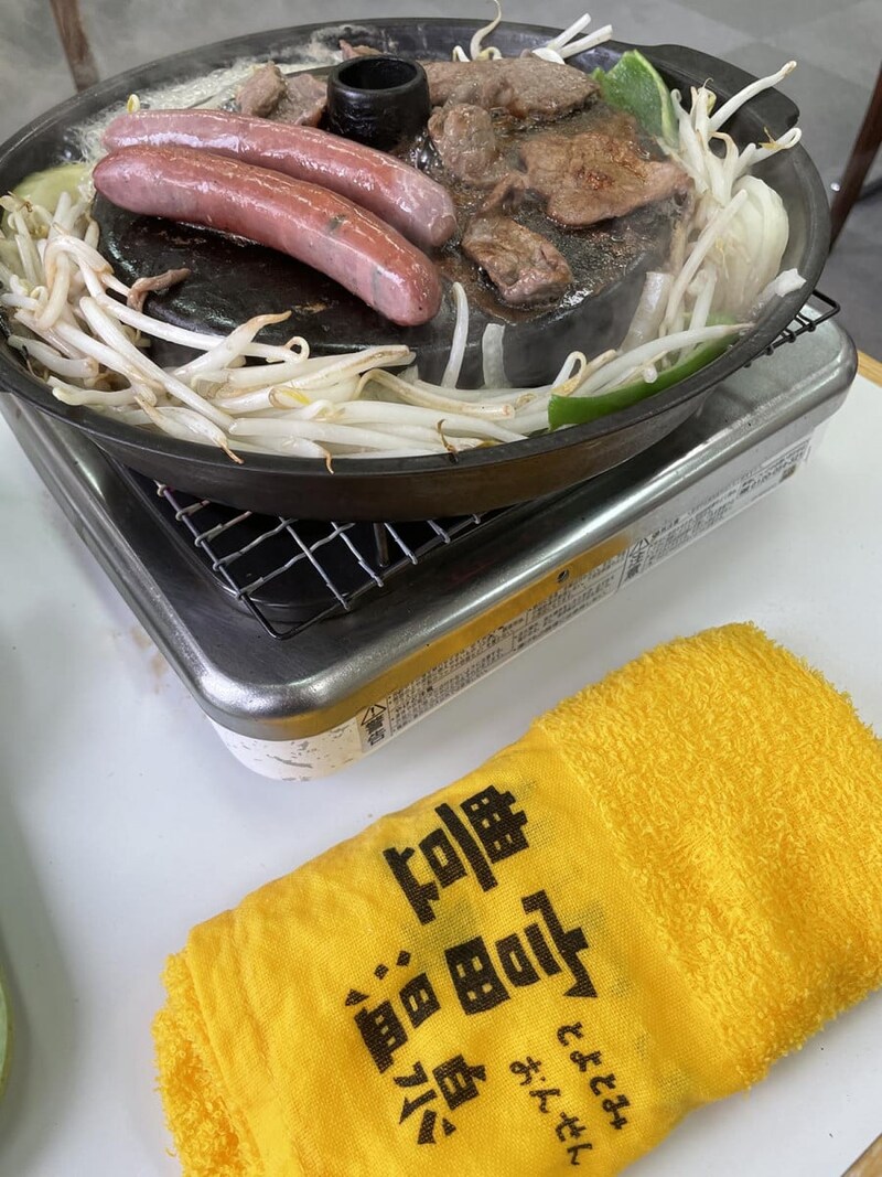 あとはテーブルにえぞ鹿ジンギスカンライス付きを持っていき、鉄鍋を自分でセットして焼きはじめる。しっかりもやしもあるし、えぞ鹿ソーセージとえぞ鹿ジンギスカンをジュウジュウと焼き始める。本格的! ここ、温泉なんだけど、いま、本格的なジンギスカンを食べてる。ミスマッチだけど超マッチなシチュエーションが幸せすぎる。